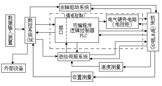 確保機床內部元件安裝正確後,需對設備進行聯機調(diào)試。按照設計功能需求,設計對應的PLC程序並調試。著重檢測各執行元件、各(gè)輸(shū)入輸出信號的正確性。數控機床的(de)PLC程序與數控係統中各部分的關(guān)係.